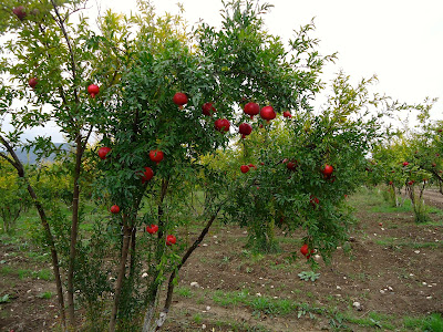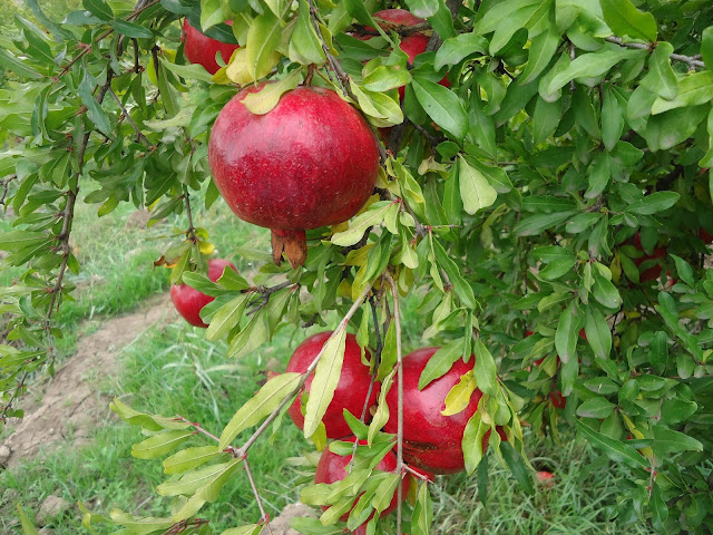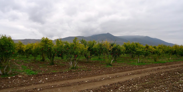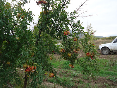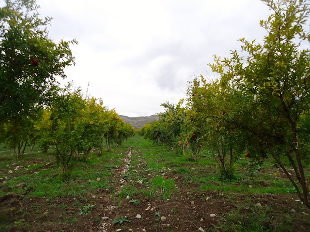 "Then, we got to Askeran. There are many pomegranate orchards whose owners sell fresh fruits in Yerevan and elsewhere in Armenia, keep them in fridges to sell them during winter time or make very tasty wine out of them. Artsakh's soil is very good. Actually, its other name, i.e. Karabakh, means in Turkish "black" ("kara") "garden" or "soil" ("bakh"). Water availability, in particular through government programs, contributes further to making it an excellent place to grow pomegranate bushes. We visited one of the largest orchards there.
