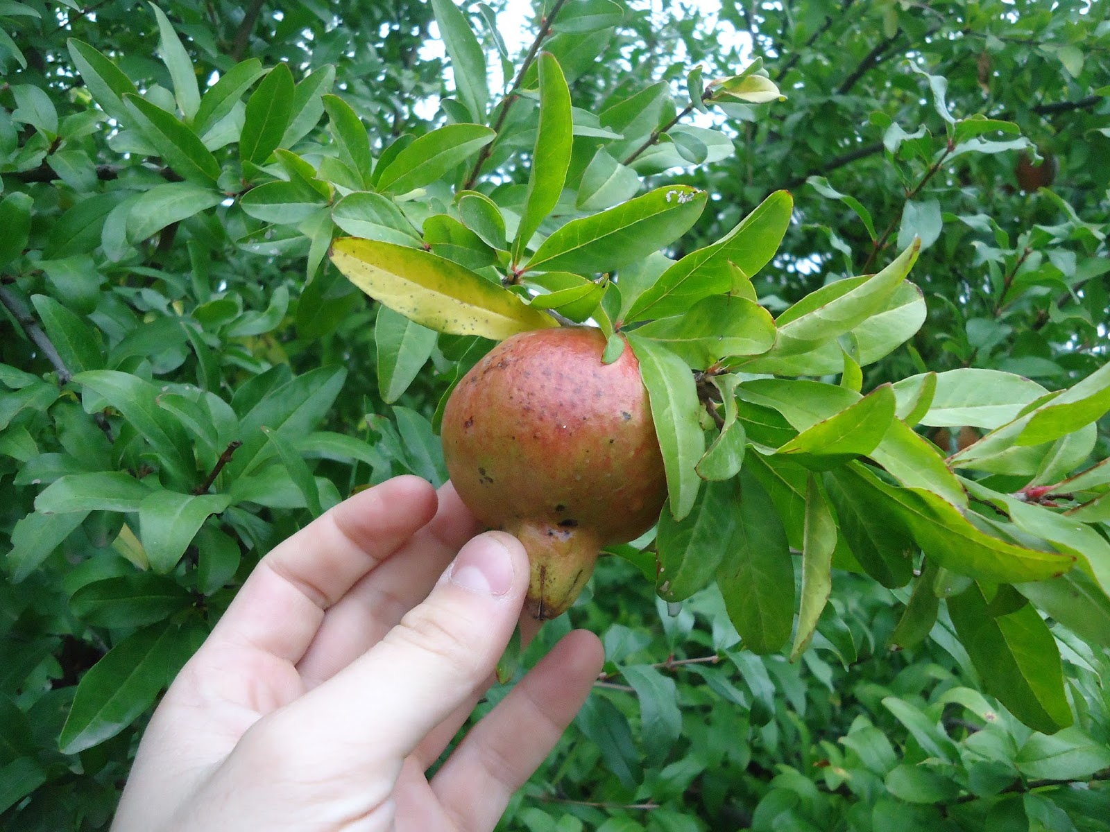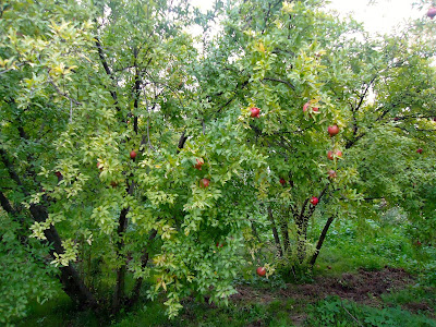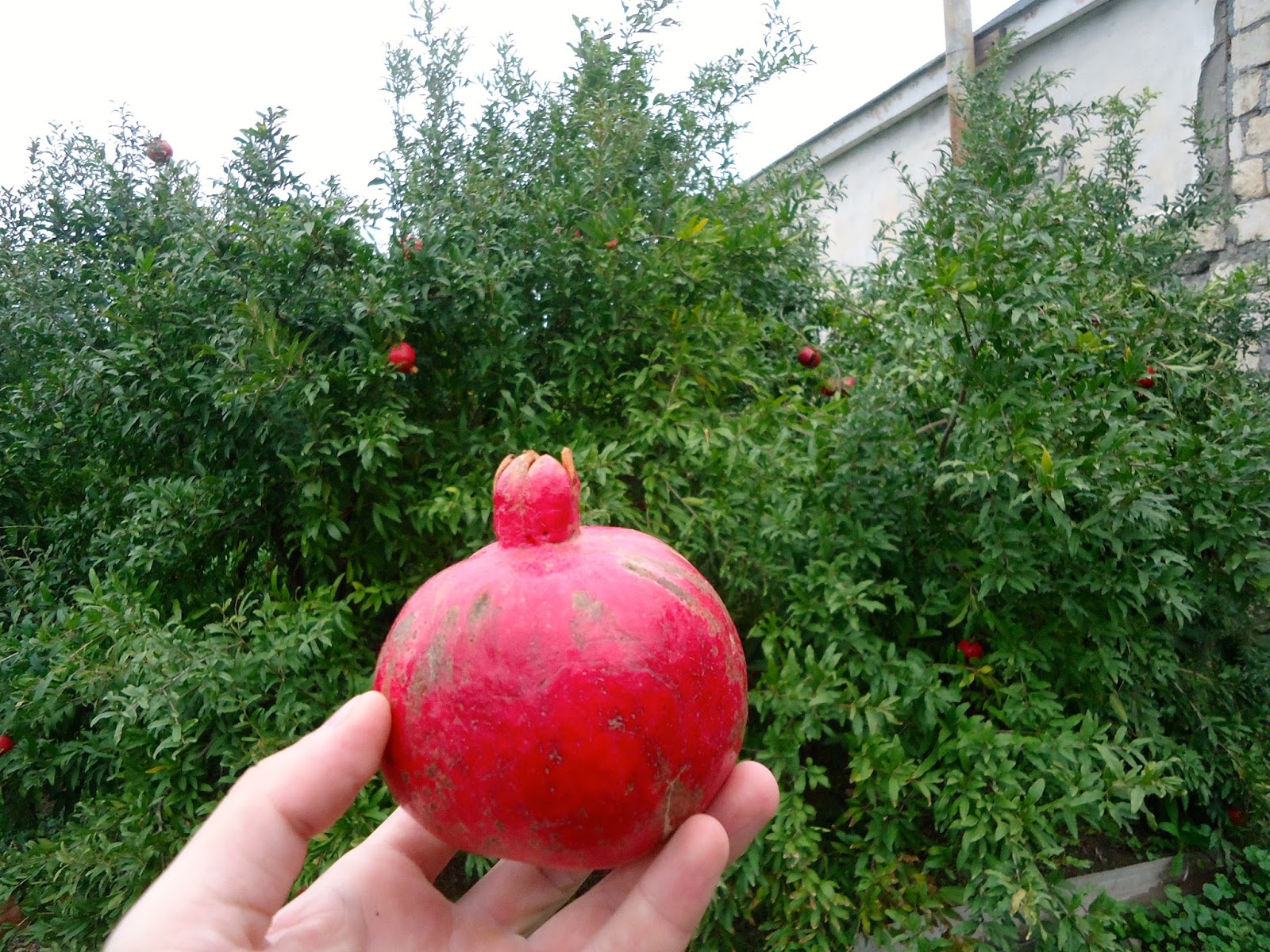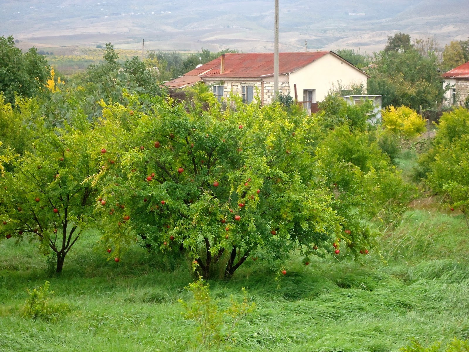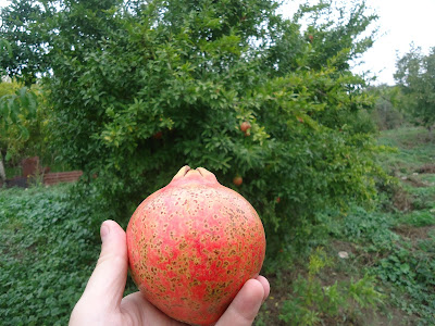 "In Shaili, we met with the pomegranate orchardist Armen. He told us that he only cultivates two of the most widespread cultivars which he referred to as Gyulasha 1 and Myursa. They probably correspond respectively with "Gyulasha Armenia" and "Bala-Myursal", the latter meaning "Cherry of Myursal" and being referred to in Ashton's volume on pomegranates. Gyulasha Armenia has large bushes with standing upright branches going up to 5 meters. The fruit is round and flat with a convex base and a wavy peak. It has thin, flexible, smooth and shiny rind. It tastes sweet-tart. Gyulasha Armenian is very abundant and in a season, it produces nearly 20 kg harvest per tree. Here are some Gyulasha Armenia bushes.