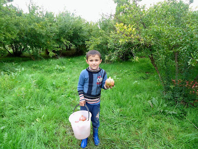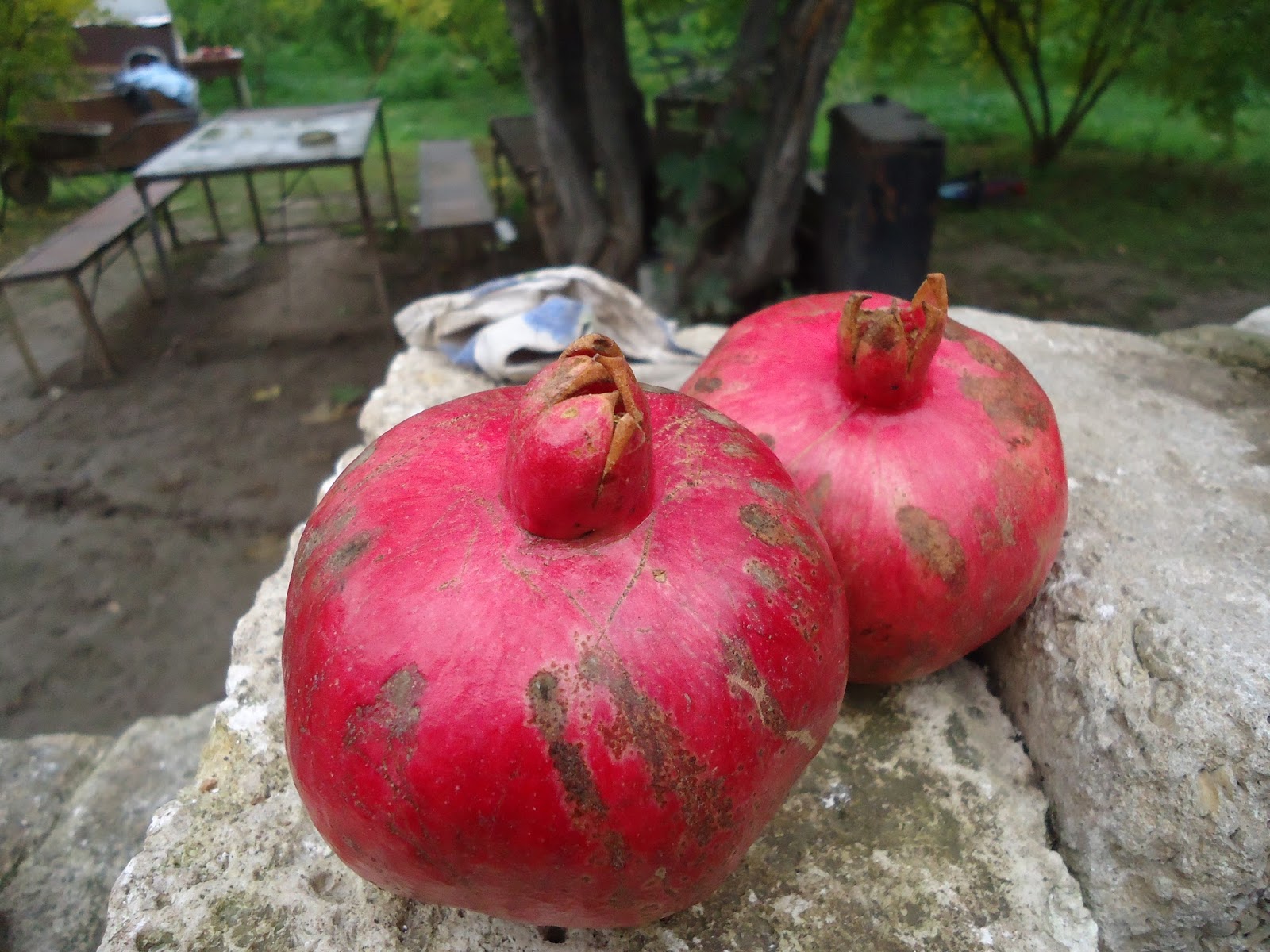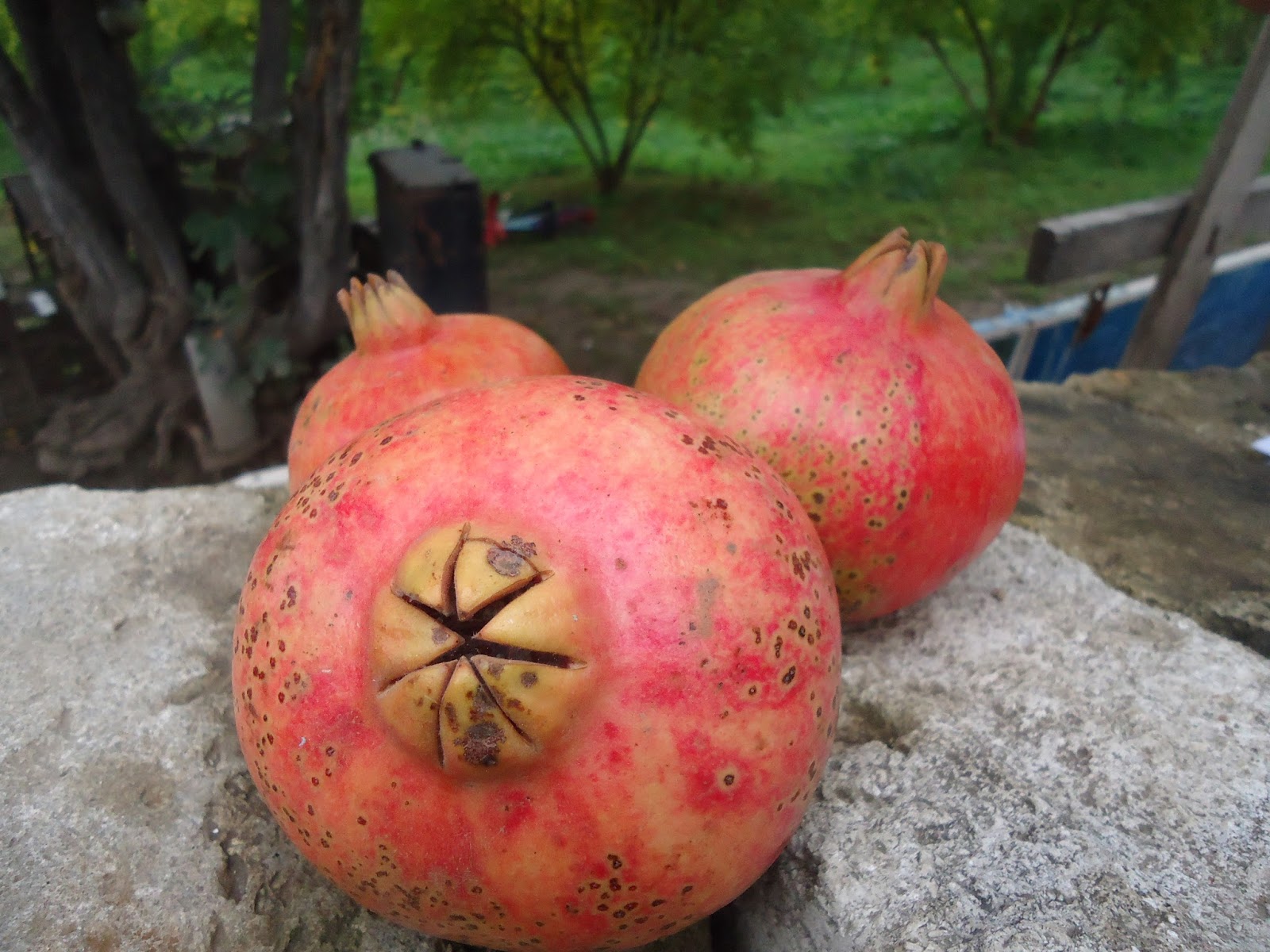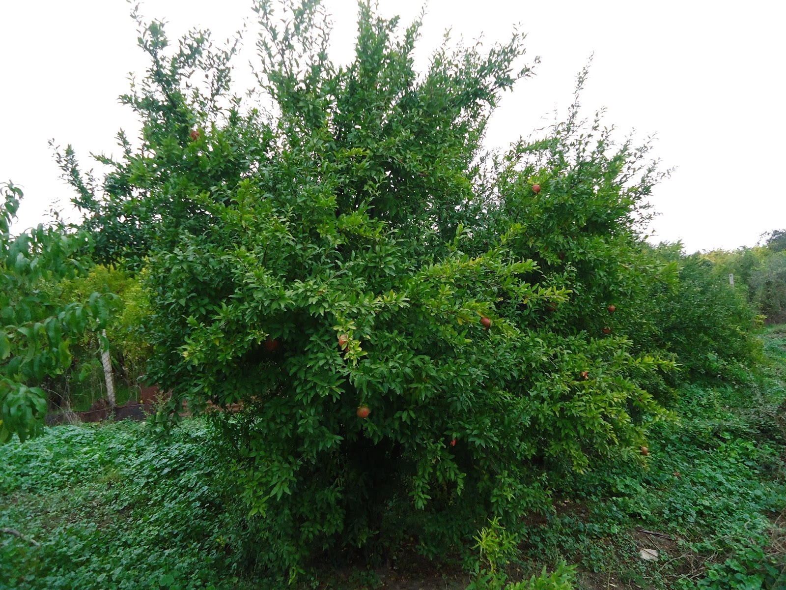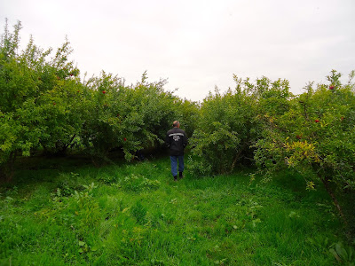 "In Shaili, we met with the pomegranate orchardist Armen. He told us that he only cultivates two of the most widespread cultivars which he referred to as Gyulasha 1 and Myursa. They probably correspond respectively with "Gyulasha Armenia" and "Bala-Myursal", the latter meaning "Cherry of Myursal" and being referred to in Ashton's volume on pomegranates. Gyulasha Armenia has large bushes with standing upright branches going up to 5 meters. The fruit is round and flat with a convex base and a wavy peak. It has thin, flexible, smooth and shiny rind. It tastes sweet-tart. Gyulasha Armenian is very abundant and in a season, it produces nearly 20 kg harvest per tree. Here are some Gyulasha Armenia bushes.