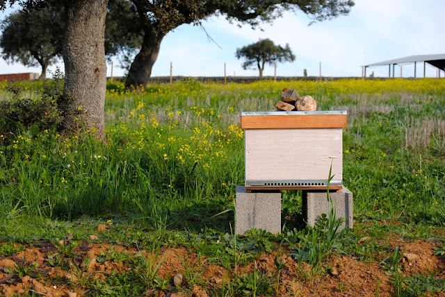 Durant la seconde moitié du vingtième siècle, la Horta avait son rucher à l'abri d'un petit toit, du côté extérieur de son mur oriental. Alors, quand j'ai rencontré Marco par hasard chez le serrurier de Reguengos cet été, je me suis dit que le retour des abeilles était peut-être pour bientôt. La première ruche de Marco est arrivée à la fin de l'automne et il semble que les abeilles se plaisent en cette fin janvier. Reste à passer le premier grand test: l'été!