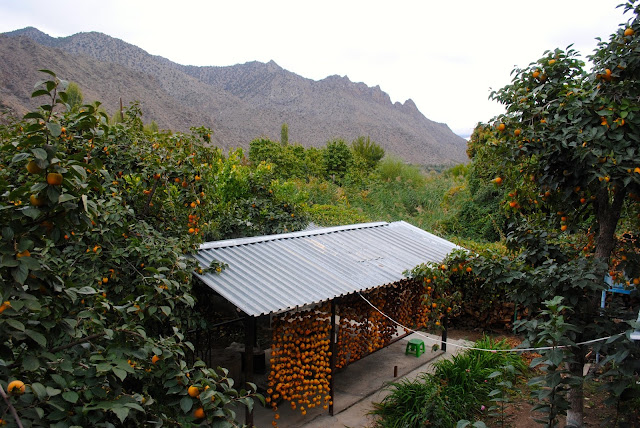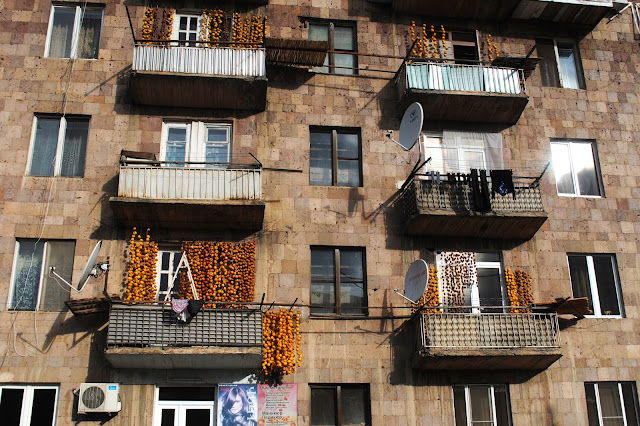 In Nrnadzor, the astringent persimons are hung in a particularly artistic manner! The technique is known from Japan. See here for some further details about how the Japanese do it. In the Meghri area, the practice is widespread. The fruits are pealed and hung to be dried for two months or so. They will be ready for christmas!
